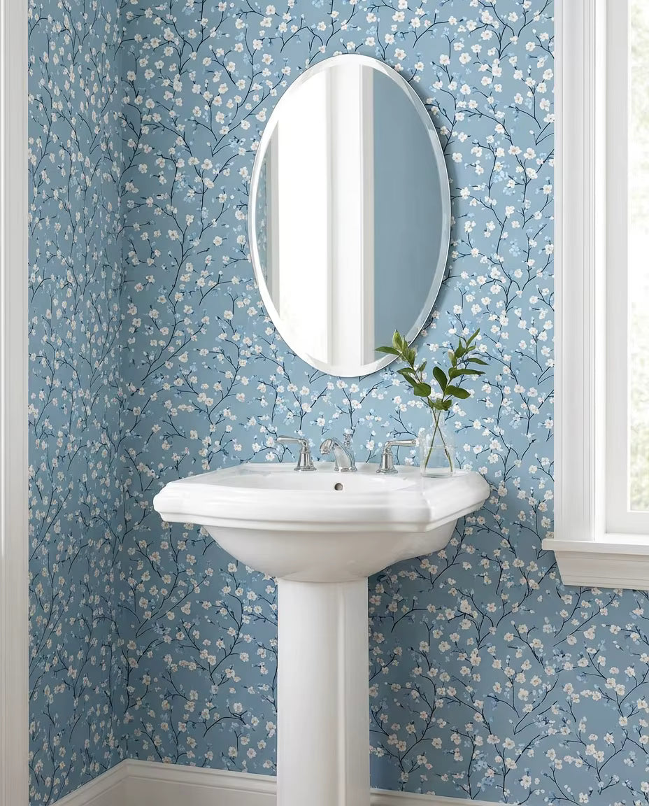 A delicate scattering of soft blossoms drifts across graceful branches in this airy botanical design. Gentle white florals and watercolor blue buds create a light, serene pattern that brings subtle movement without overwhelming the space. The balanced scale and organic flow make it ideal for nurseries, bedrooms, powder baths, and layered cottage interiors.