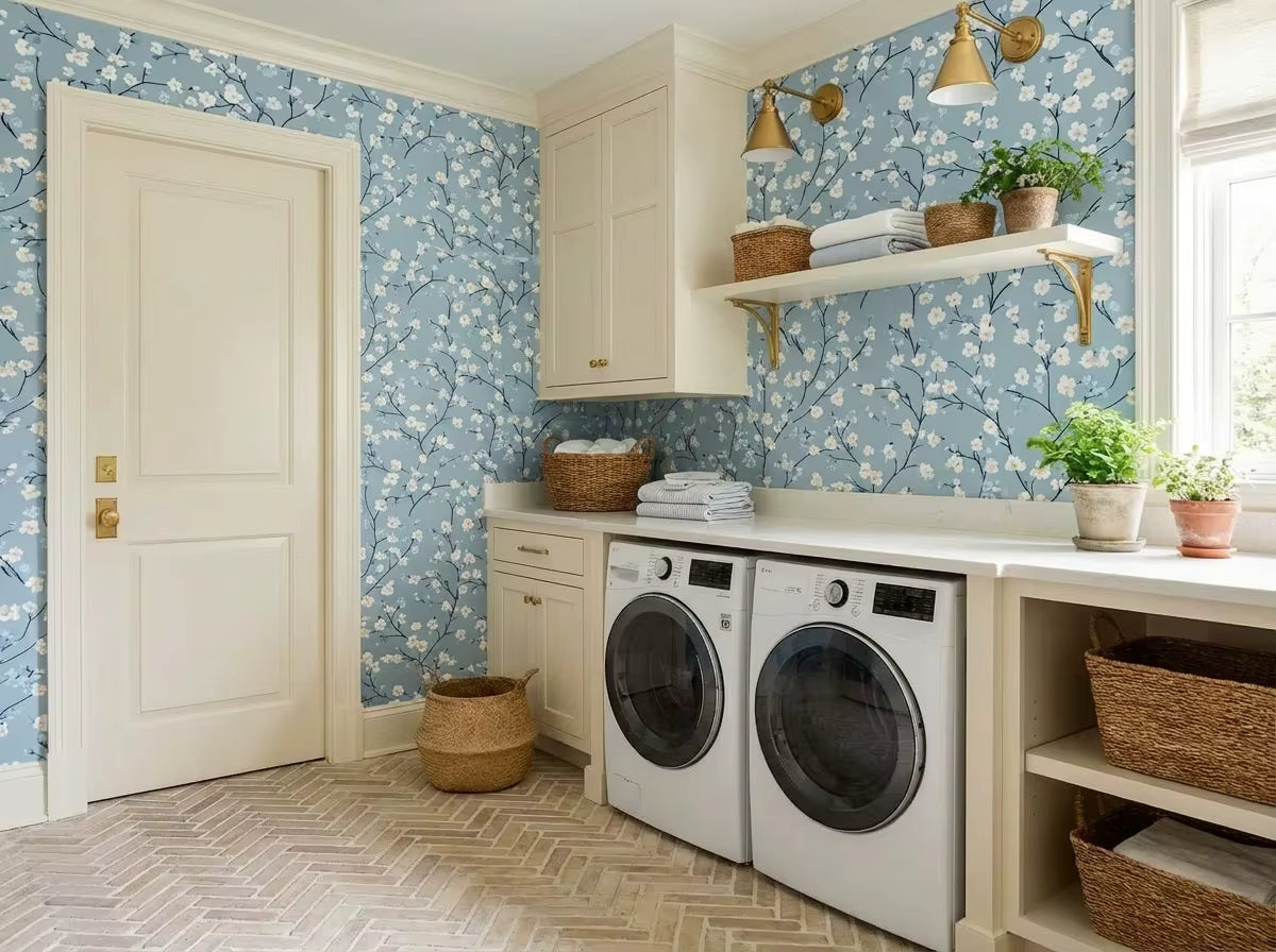 This print blends classic botanical charm with modern softness, offering a timeless wallpaper that feels both fresh and comforting.