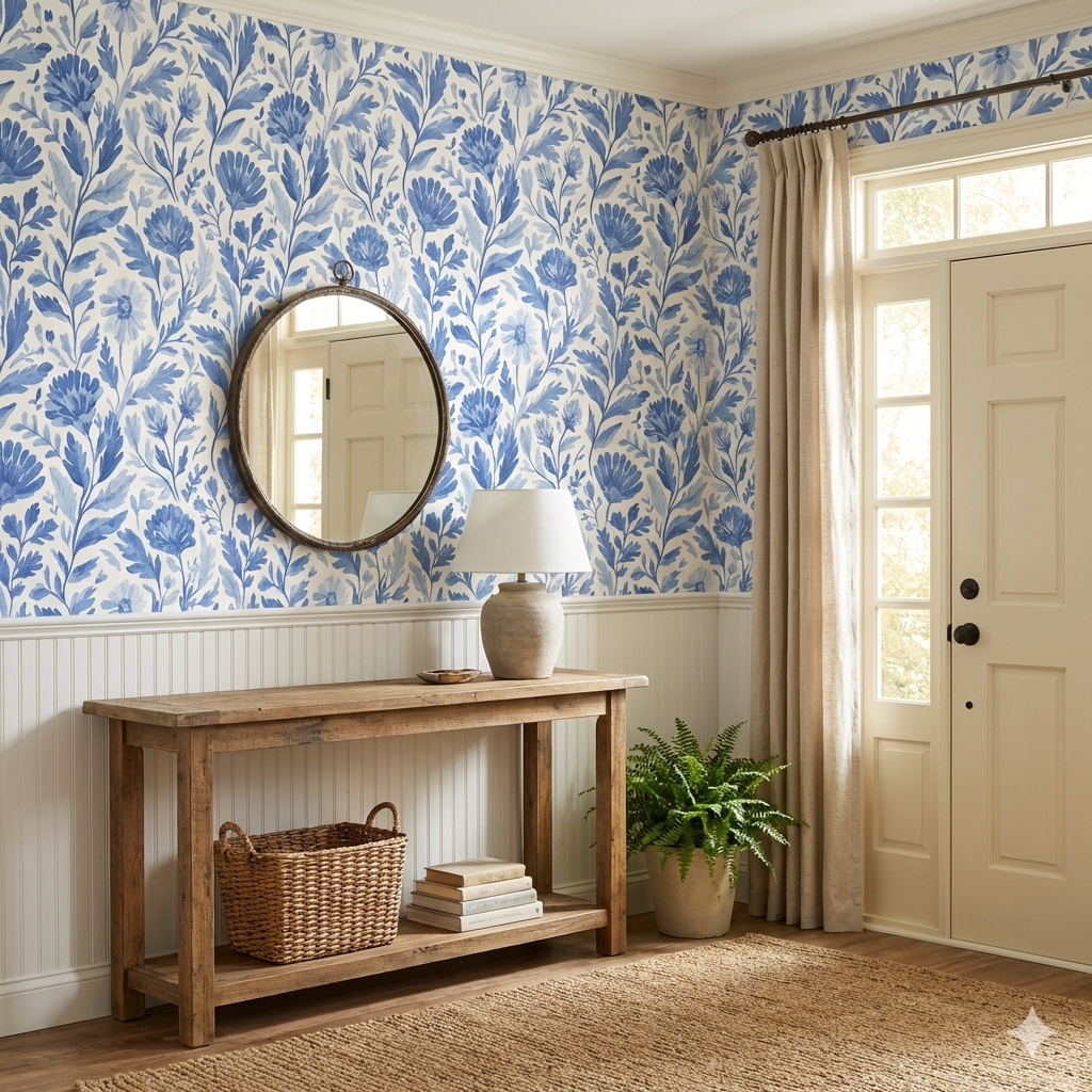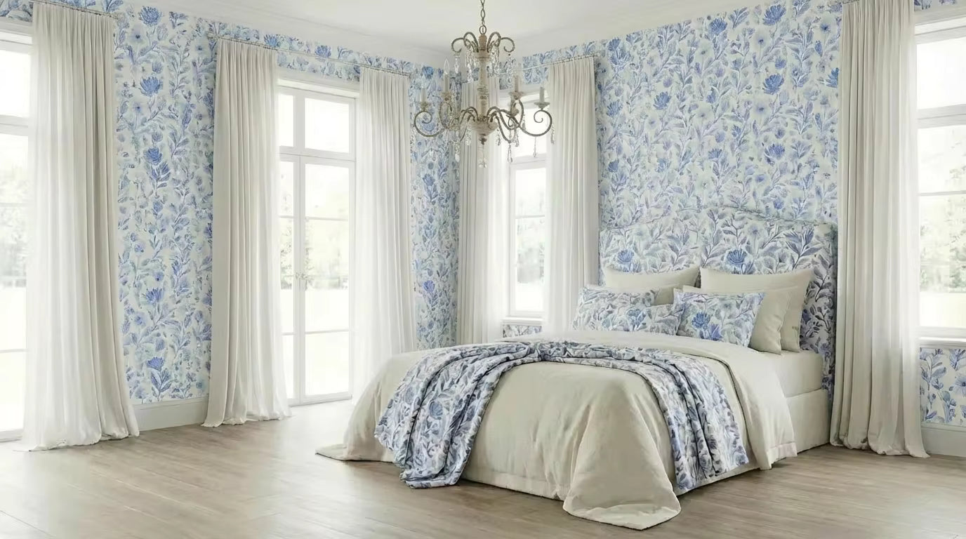 Perfect for bedrooms, bathrooms, dining rooms, and serene living spaces, Blue Meadow Reverie pairs effortlessly with crisp whites, natural woods, vintage accents, and classic interiors. It’s an elegant choice for those who love timeless design with a soft, artistic touch.
