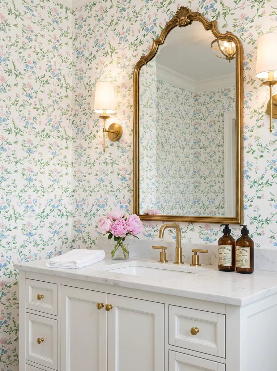 Bluebell Garden Trellis is ideal for nurseries, bedrooms, powder rooms, breakfast nooks, and cottage-inspired interiors. It pairs beautifully with warm whites, natural woods, soft blues, and vintage-inspired accents.