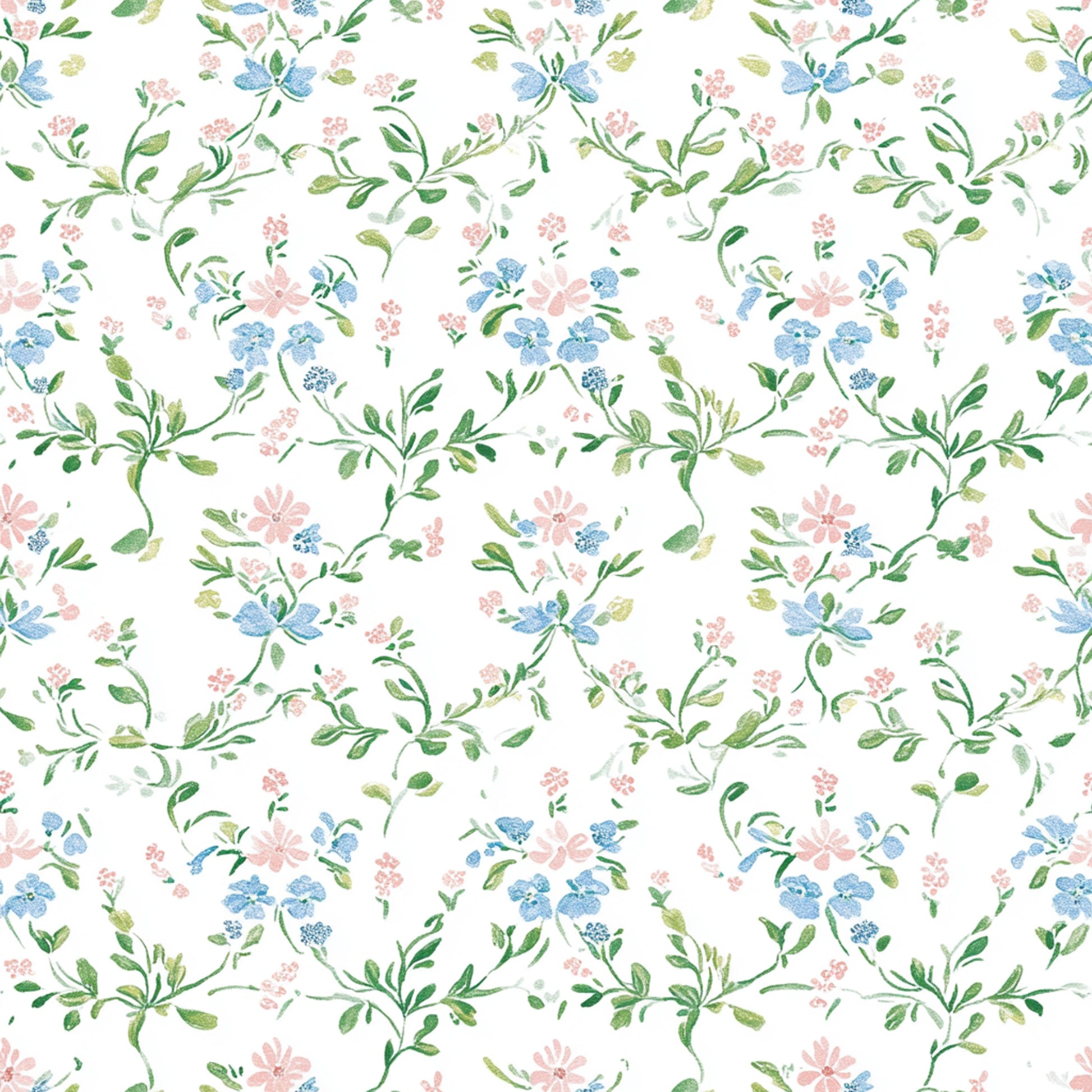 Bluebell Garden Trellis is a soft watercolor floral wallpaper featuring delicate blue blossoms, blush pink florals, and fresh green vines arranged in an airy trellis pattern. Light and graceful, this design evokes the charm of an English garden in bloom.