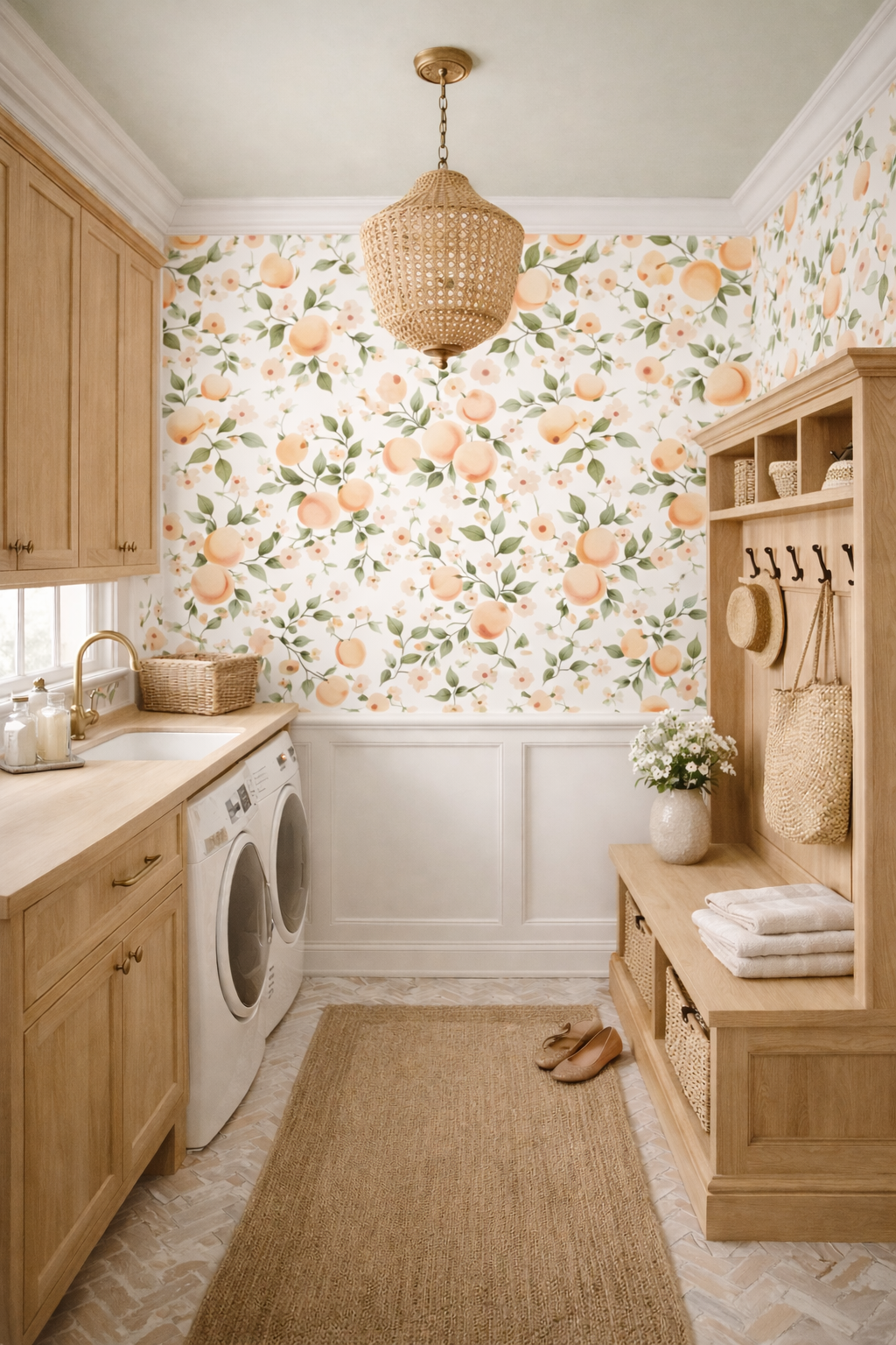 Inspired by sun-ripened orchards and blooming Southern gardens, Georgia Peach Blossom pairs soft watercolor peaches with delicate blush florals and winding green vines on a warm ivory ground. The painterly details and gentle color palette create a fresh, inviting pattern that feels equal parts charming and refined. This design brings a lighthearted Southern elegance to kitchens, breakfast nooks, nurseries, powder baths, and cottage-style spaces—perfect for adding warmth, character, and a touch of everyday romance.
