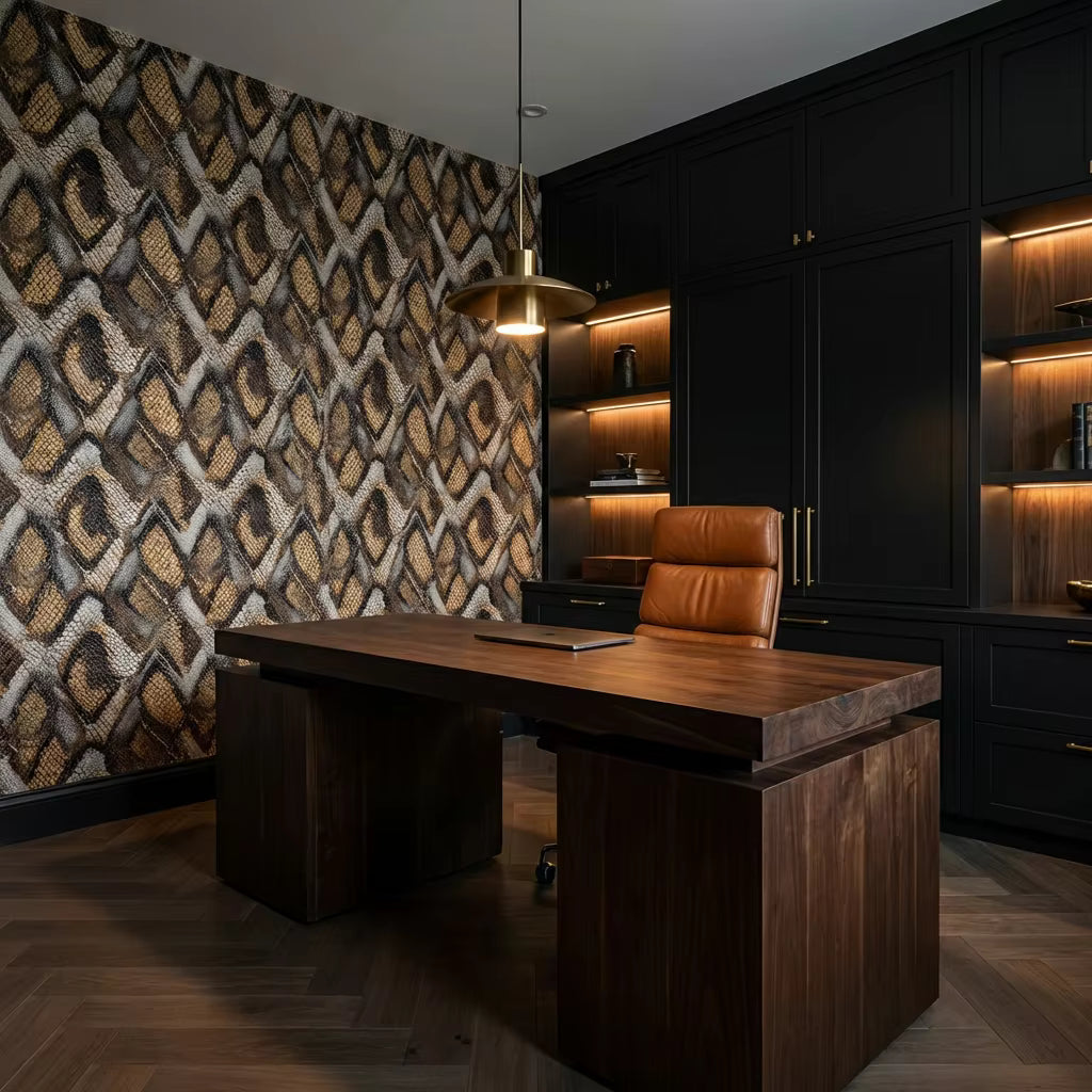 Gilded Python is a striking, high-fashion wallpaper inspired by the intricate scales and natural movement of python skin. Warm golden browns, deep espresso tones, and soft ivory highlights create a richly layered design with exceptional depth and texture.