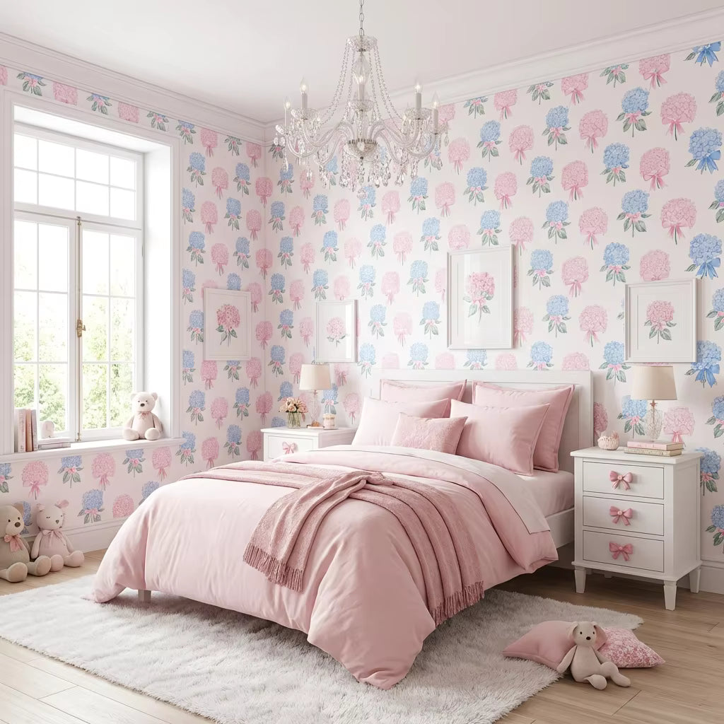 Hydrangea Bow Garden is a soft, storybook wallpaper featuring hand-painted hydrangea blooms tied with delicate satin bows in blush pink and powder blue. Set against a clean ivory backdrop, this design feels light, timeless, and effortlessly charming—like a summer afternoon in a Southern garden.