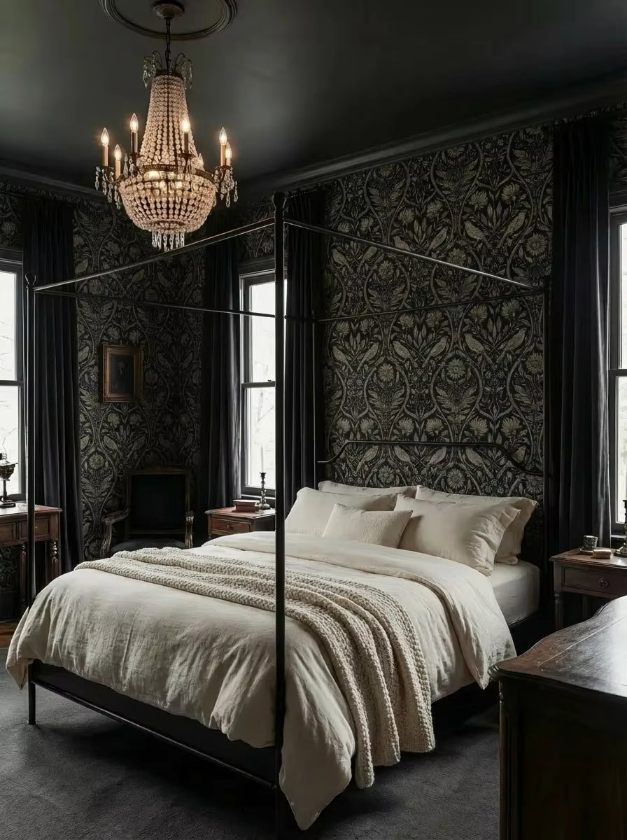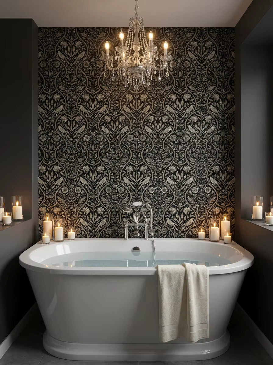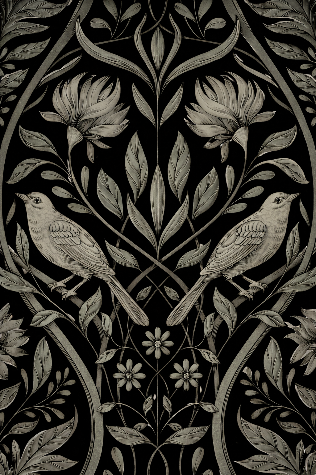 Midnight Aviary is a sophisticated botanical wallpaper featuring mirrored songbirds nestled among flowing vines and delicate florals. Rendered in layered charcoal, warm greys, and soft greige against a deep black backdrop, this pattern creates dramatic contrast while remaining refined and timeless. The intricate linework and symmetrical composition evoke classic European textile design with a modern Studio McGee–inspired palette, making it perfect for statement powder rooms, dining rooms, and elegant entryways.