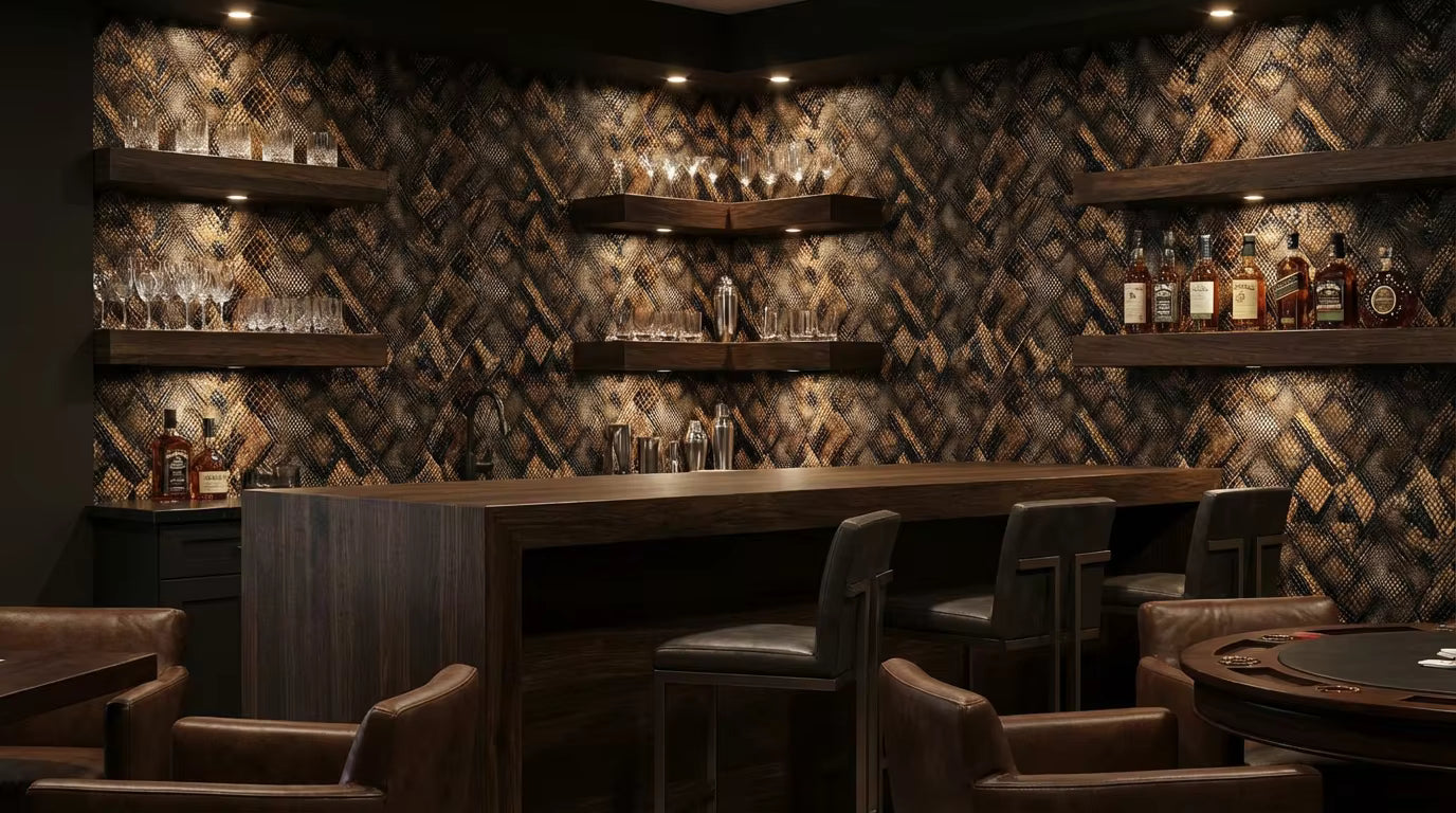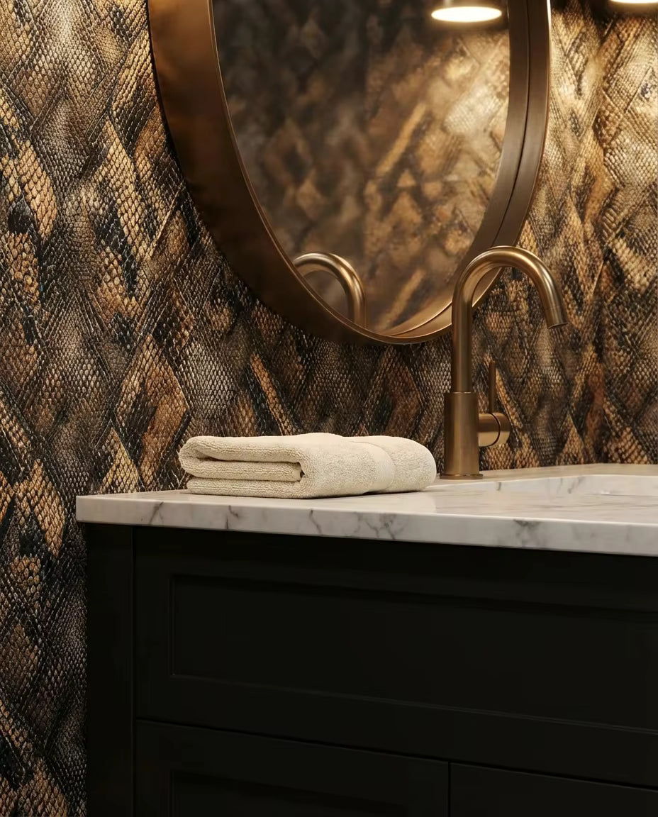 With its earthy tones and natural movement, Smoked Saddle Python creates a statement without overwhelming — making it perfect for masculine offices, moody powder rooms, statement entryways, or boutique-inspired dressing spaces.