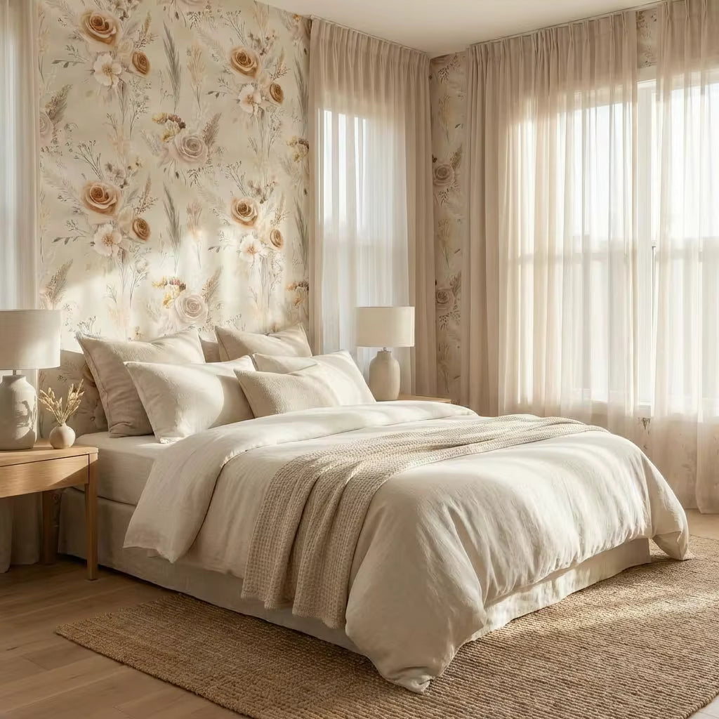 This design is inspired by dried florals, heirloom gardens, and quiet countryside beauty—bringing a sense of calm and understated elegance to any space. Perfect for bedrooms, powder baths, dining rooms, or cozy living areas, Soft Wheat Rose pairs effortlessly with natural wood, antique finishes, linen textures, and neutral palettes.