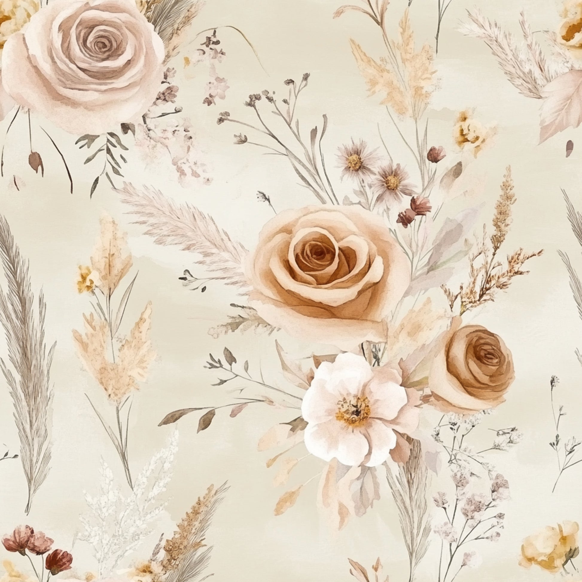 Soft Wheat Rose features delicately painted roses and airy wild botanicals layered over a warm, creamy backdrop. Subtle tones of wheat, ivory, and soft sand create a gentle, sun-washed look that feels both romantic and refined.