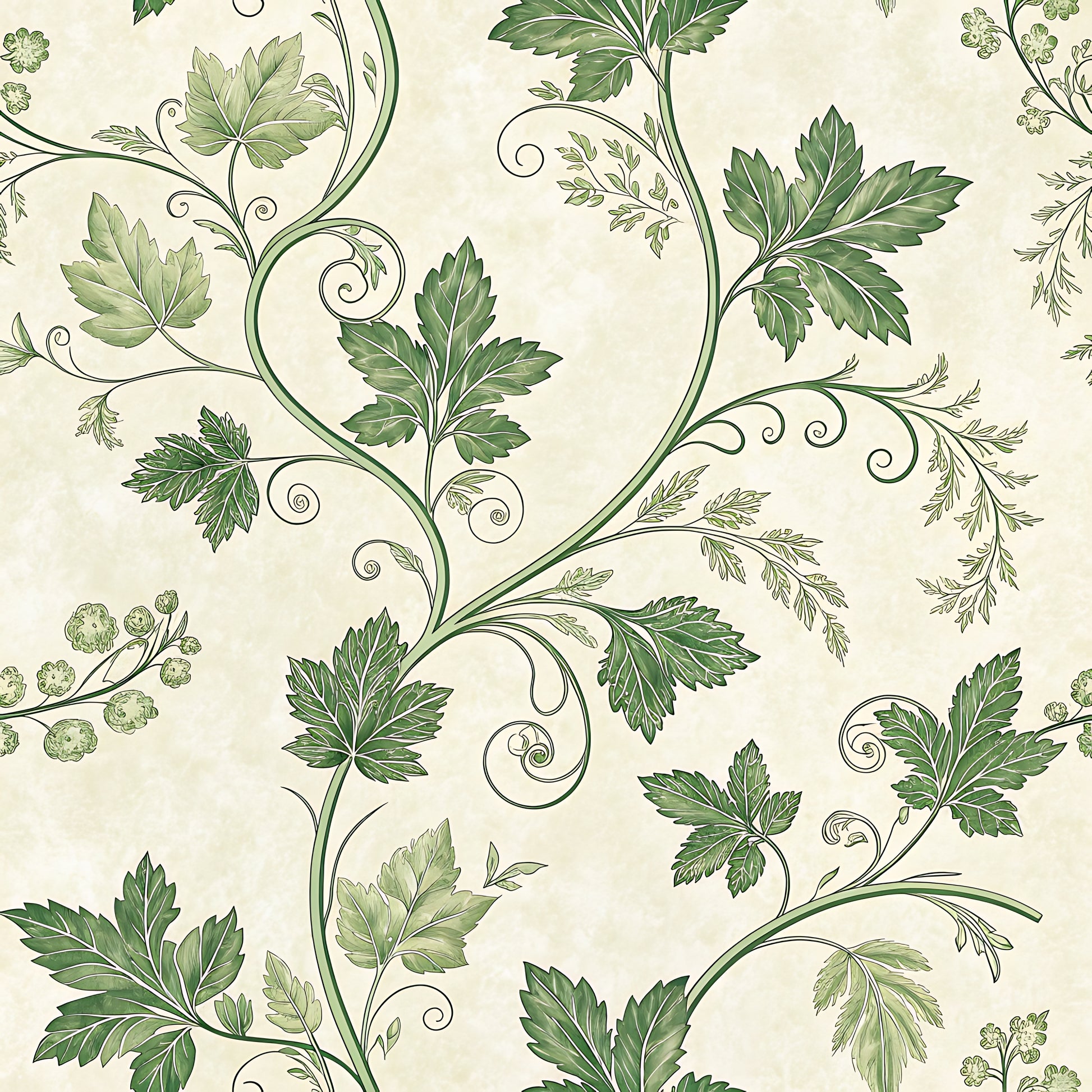 Verdant Vine is a graceful botanical wallpaper inspired by climbing garden vines and sun-drenched conservatories. Flowing stems and softly shaded green leaves unfurl across a warm, light background, creating an open and inviting design that feels both fresh and timeless.