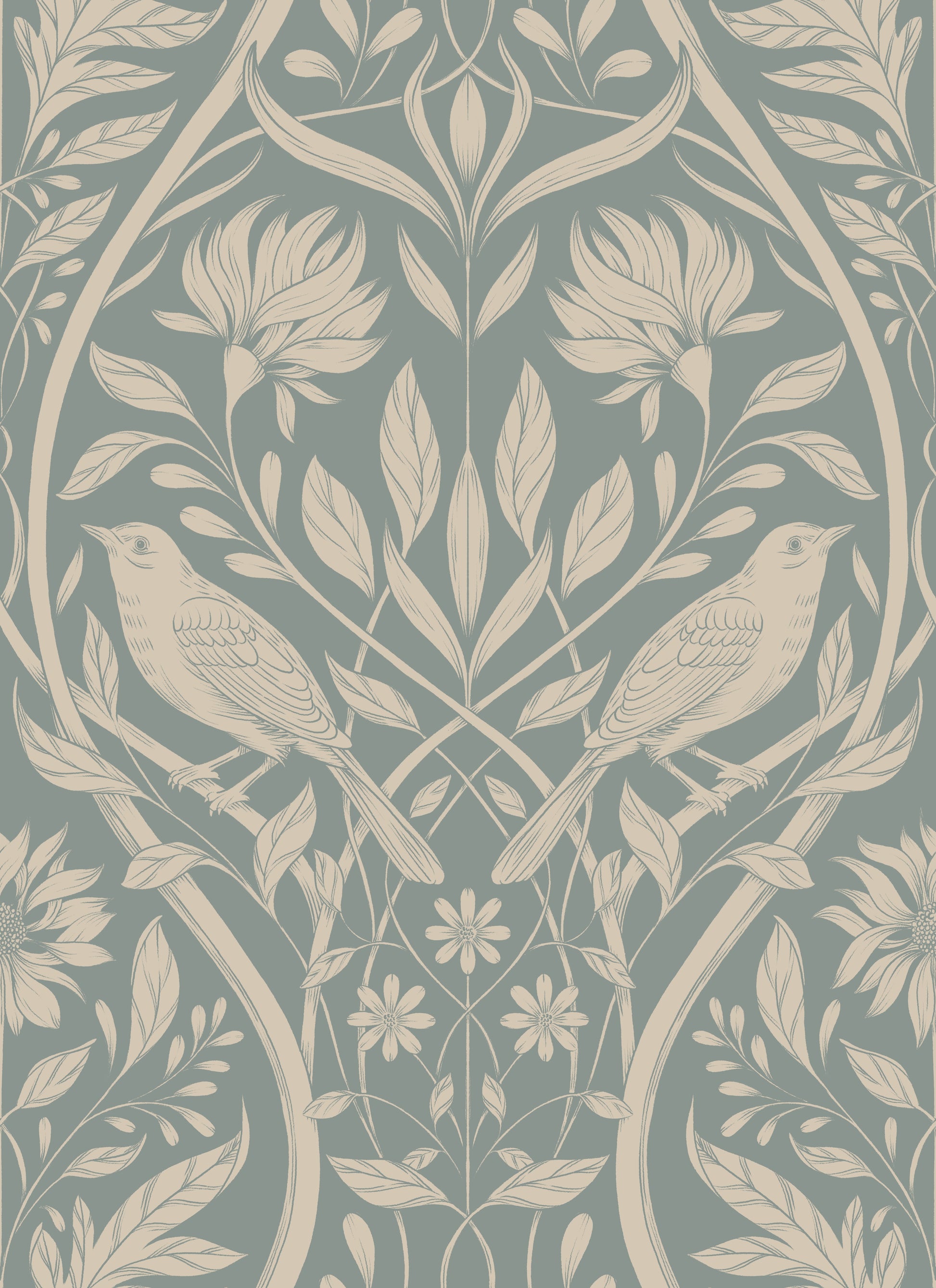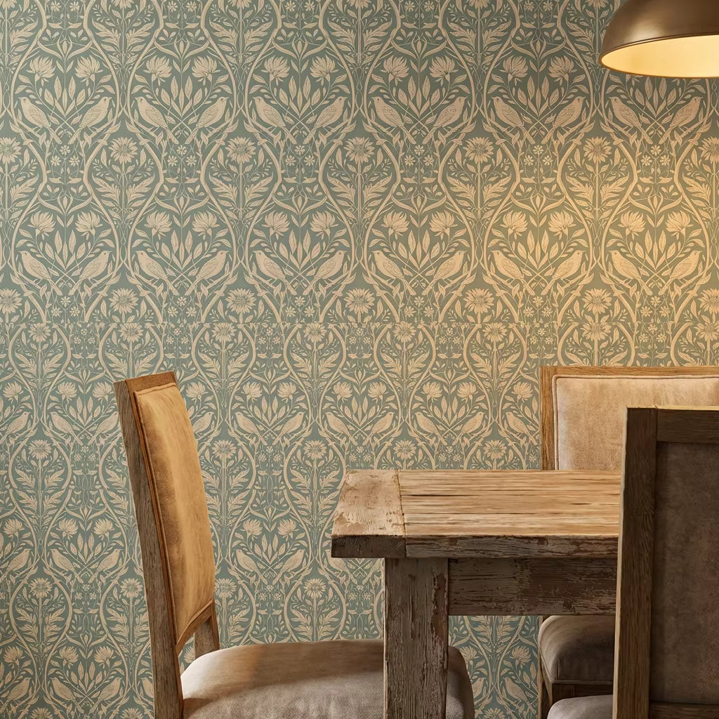 Graceful and timeless, Willow & Wren features delicately illustrated birds nestled among flowing botanicals in a soft, muted green palette. Inspired by vintage European wallpapers and classic Arts & Crafts motifs, this design balances symmetry with organic movement for a look that feels both refined and welcoming.